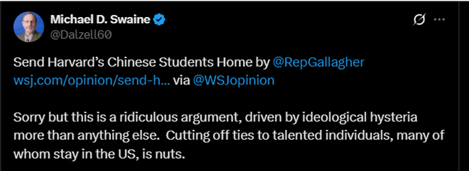 总之,加拉格尔如今在《华尔街日报》上歇斯底里地对中国留学生和哈佛大学的意识形态狂喷口水,也是美国当下右翼保守派与“觉醒文化”极端对立的一种延续。但在那些理性的美国学者、清醒的美国网民,以及广大外国网民看来,他们看到的只是一个政治“小丑”,在一个越来越癫狂的政治氛围下的,痴人呓语。
