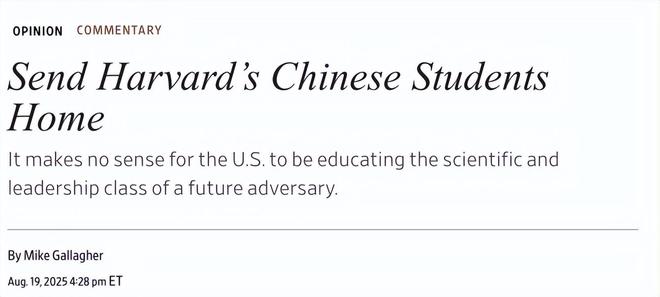 近日,美国《华尔街日报》的评论版刊登了一篇让美国学术界哭笑不得的文章。因为这篇文章的作者——被中方制裁的美国反华政客麦克·加拉格尔(Mike Gallagher),竟公开呼吁美国政府把哈佛大学的中国学生赶回中国。