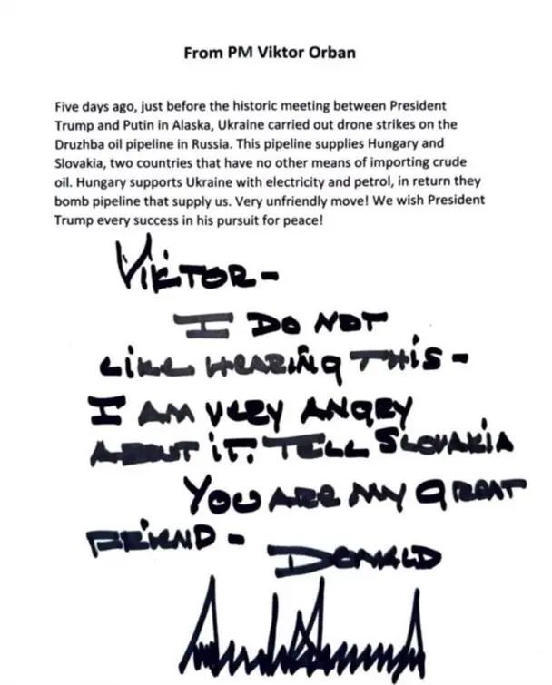 据中新网、环球网等8月23日援引美国媒体报道,特朗普在给欧尔班的一封手写回信中直言,自己对乌克兰军队袭击俄罗斯“友谊”输油管道感到“非常愤怒”!