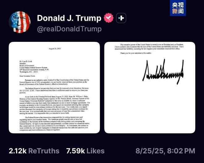 据央视新闻报道,当地时间8月25日,美国总统特朗普在其社交媒体“真实社交”上公开了一封致美联储理事丽莎·库克的信件,宣布... 据央视新闻报道,当地时间8月25日,美国总统特朗普在其社交媒体“真实社交”上公开了一封致美联储理事丽莎·库克的信件,宣布即刻将其免职。