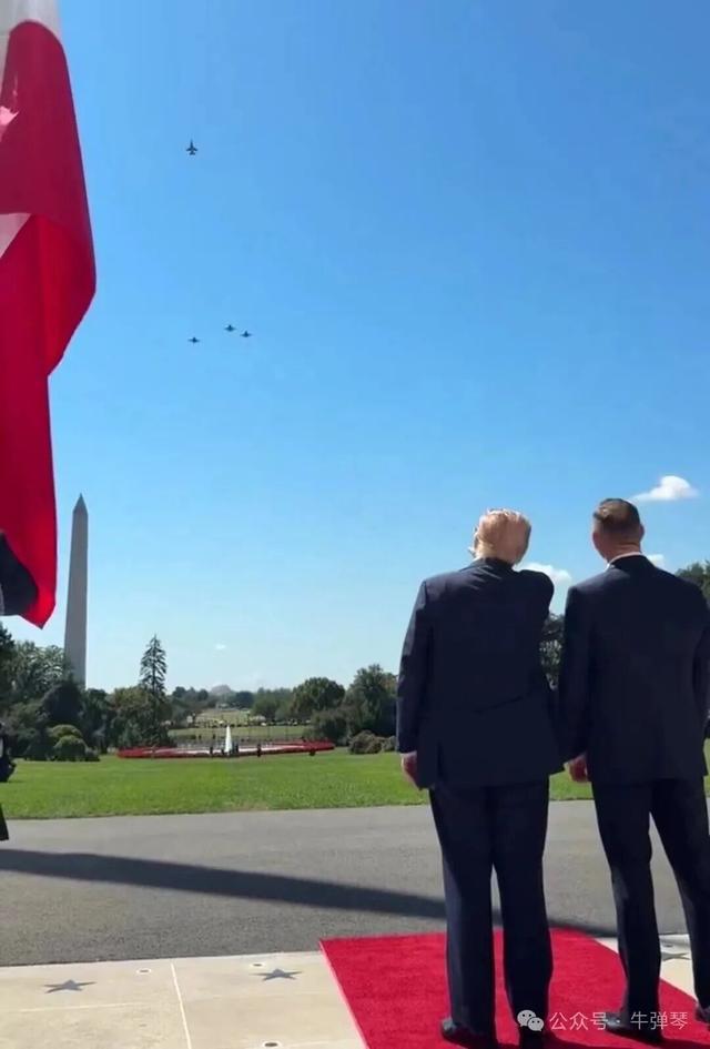 多架F-16和F35战机,排成队形,从白宫上空掠过。特朗普和纳夫罗茨基驻足观看。