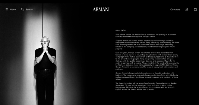 直至逝世前,乔治·阿玛尼仍是阿玛尼集团唯一实际股权持有人 图片来源:Giorgio Armani官网
