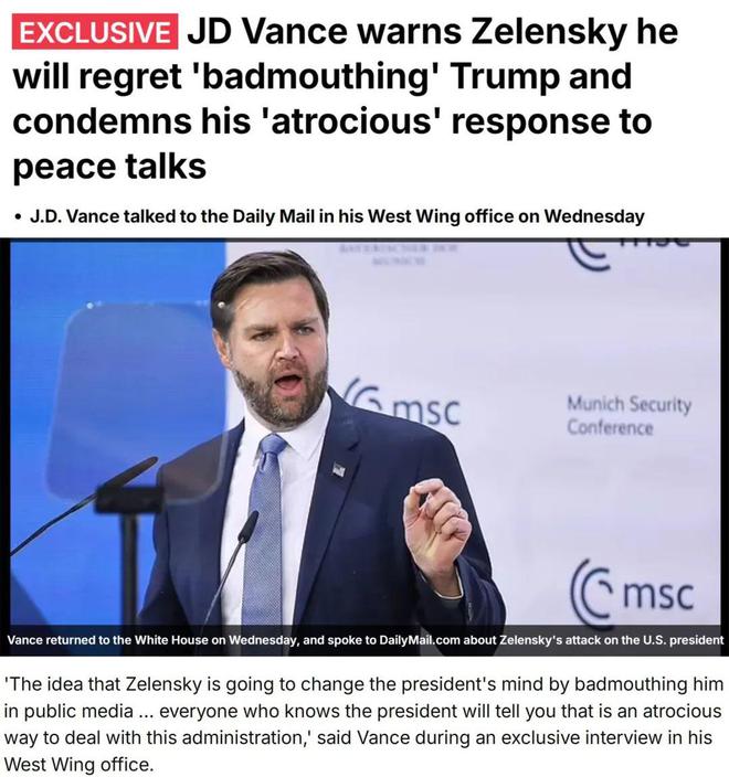 万斯喊话泽连斯基:“这是一种糟糕方式”