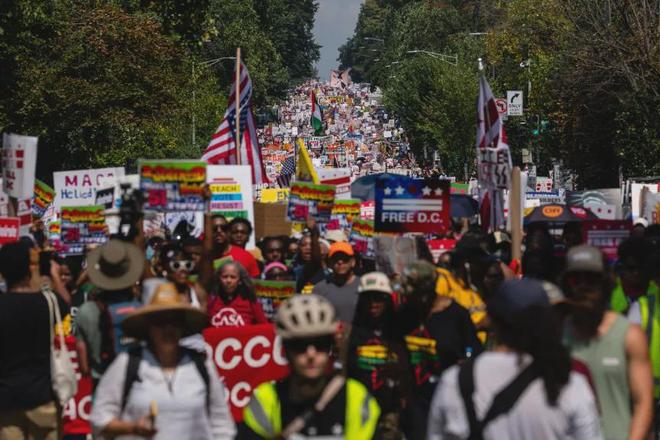 当地时间2025年9月6日,美国华盛顿,示威者在美国国会大厦附近举行“我们都是华盛顿特区人”全国游行,声援华盛顿特区社区,并呼吁结束国民警卫队在该地区的部署 美媒