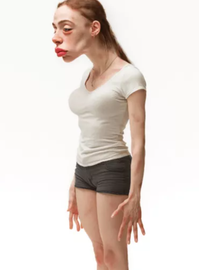 图片显示,“艾娃”站姿不正确,脸部比例失调。她的皮肤上布满了斑点,头发稀疏,眼睛红肿,黑眼圈和眼袋也加重了。该研究指出,长时间使用智能手机的人的颈椎通常“处于15到60度的屈曲位置”,“艾娃”驼背的姿势源于长时间使用智能手机导致的“短信颈综合症”,该综合症会导致圆肩和头部前倾,这些症状可能会成为永久性的,还会引发慢性颈部疼痛。