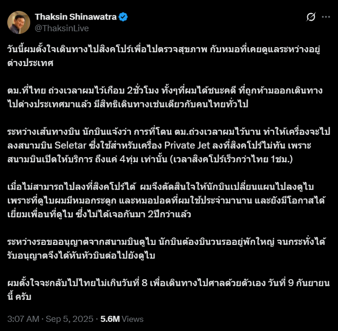 阿努廷深谙司法手段的政治威力,通过盟友放出消息:最高法院将于9月9日对他信案件作出裁决,可能要求立即入狱。这一情报,精准击中他信最脆弱的神经,迫使其于9月4日晚仓促离境——名义上是“去新加坡体检,因空管延误改降迪拜”。