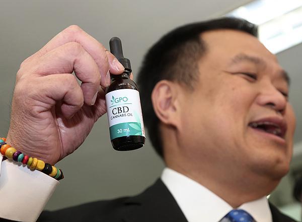 阿努廷在新闻发布会上展示一瓶提取的大麻油