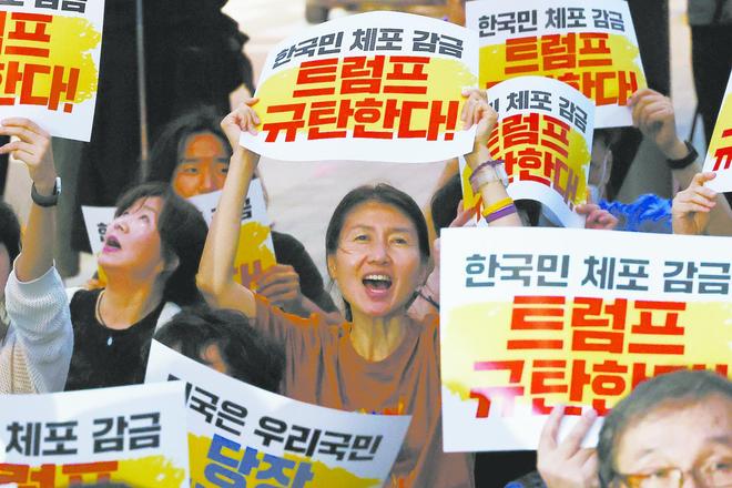 多家韩国主流媒体通过社论对美方表达强烈抗议。《韩民族日报》指出,该事件发生在韩国承诺对美投资3500亿美元后仅一个多月,韩国总统李在明与美国总统特朗普在白宫举行首脑会谈、重申“韩美同盟坚如磐石”后不到10天,“感觉后脑勺被打了一闷棍”,这动摇了对同盟信任的根基。《朝鲜日报》质问美国所说的“同盟”究竟意味着什么,令人从根本上怀疑美方所称的制度稳定性与政策持续性。