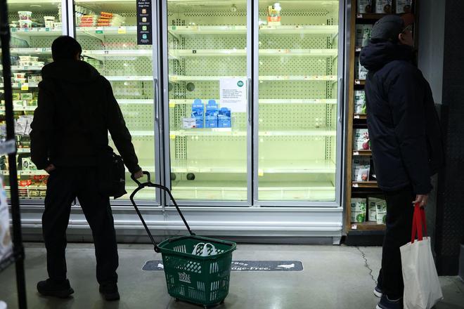 当地时间2025年2月20日,美国纽约市曼哈顿区的一家超市里,鸡蛋货架上空无一物 图据视觉中国