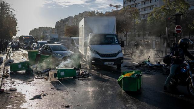 在里昂,示威者封锁城市主干道并焚烧垃圾桶;