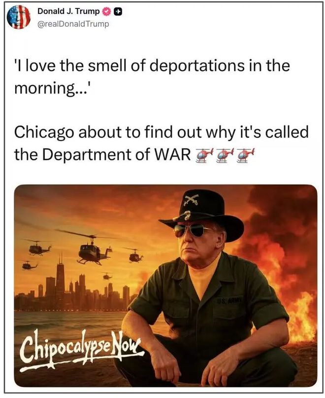话说回来,美国民众的冷嘲热讽也就罢了,但总统先生这番改名,可是预计将耗费10亿美元的大工程,也会实实在在影响美国政局与社会民生。比如,甫一改名的“战争部”,已经收到出兵任务,第一枪就指向芝加哥。热衷社交媒体治国的特朗普,模仿战争电影《现代启示录》的经典配图与台词,称其喜欢早上闻到驱逐出境的味道,再度威胁向伊利诺伊州最大城市芝加哥“派兵”……要让芝加哥知道国防部“为什么被叫作战争部”。