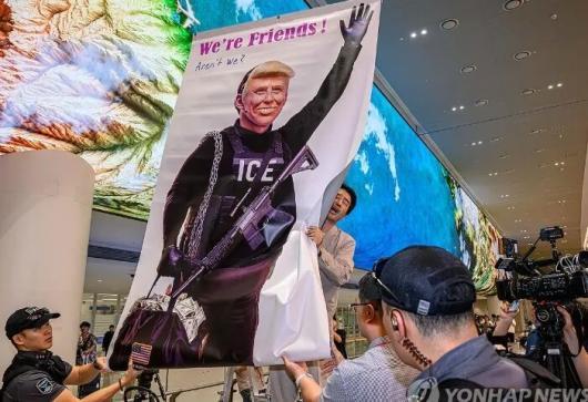 机场有抗议者要求特朗普道歉(图/韩联社)
