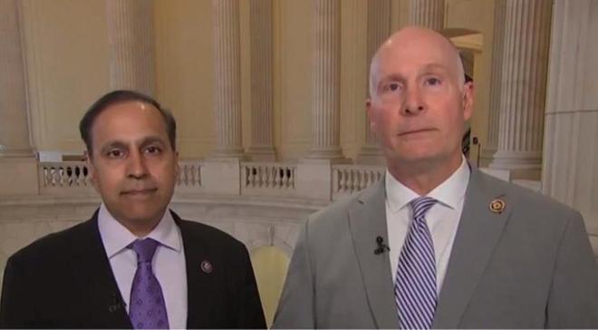 美国国会众议院“美中战略竞争特别委员会”头两号人物——共和党籍主席约翰·穆莱纳尔和民主党籍高级成员拉贾·克里希纳莫西 视频截图