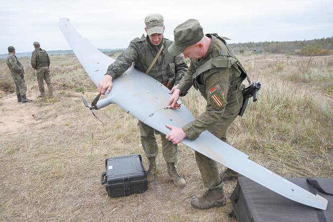 当地时间15日,在白俄罗斯首都明斯克以东的鲍里索夫附近一处训练场,白俄罗斯军人在俄白“西部-2025”联合战略军事演习中操作无人机 法新社