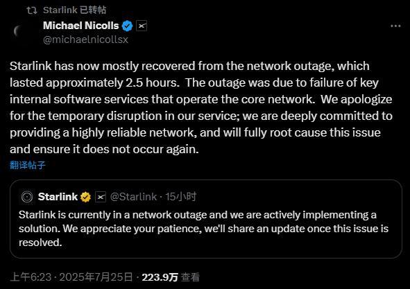 “星链”工程副总裁迈克尔·尼科尔斯晚些时候表示,断网持续约2个半小时,目前已基本恢复。