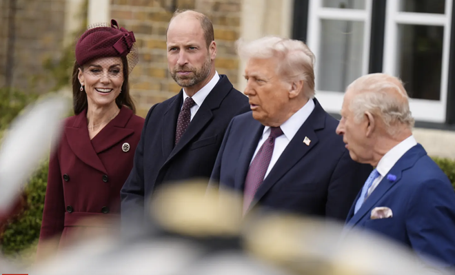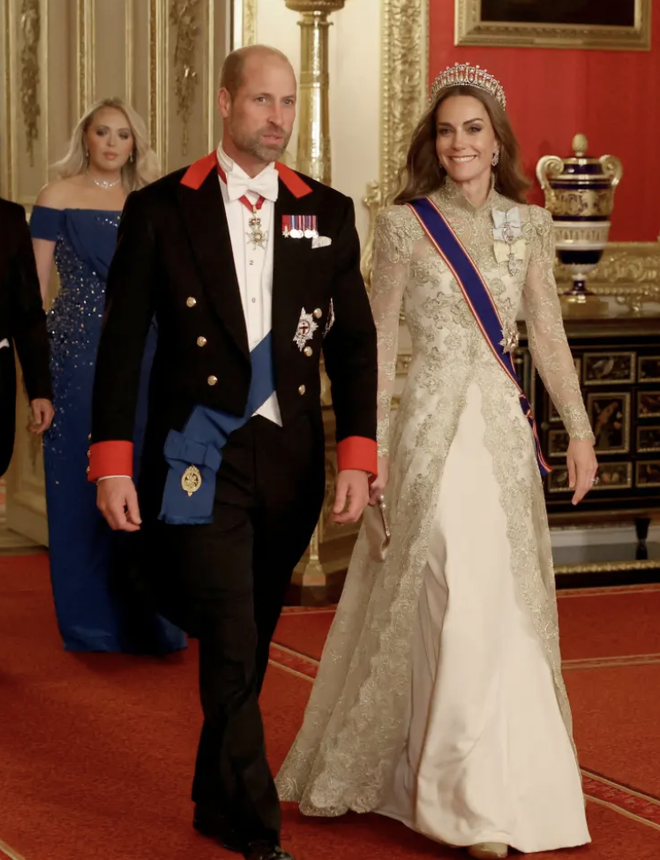 在宴会上,凯特王妃耀眼的金色礼服外,还佩戴了已故戴安娜王妃的“情人结”王冠。而在迎接特朗普的仪式中,凯特王妃身着褐红色连衣裙,戴着同色系的帽子,与身着深色西装的威廉王子迎接特朗普夫妇。特朗普两次夸赞凯特王妃:“你很美,太美了。如此容光焕发、如此健康、如此美丽的公主!”