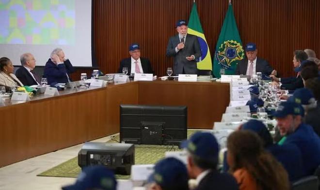 8月26日内阁会议上,卢拉和一众官员戴上“巴西属于巴西人”的蓝色帽子(图/巴西媒体)