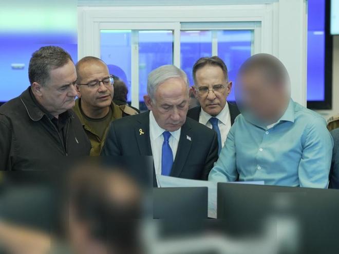 这张以色列国家安全总局(辛贝特)发布的照片显示,9月9日,以色列总理内塔尼亚胡(中)、以色列国防部长卡茨(左一)等在一处辛贝特指挥中心内交流(新华社发)