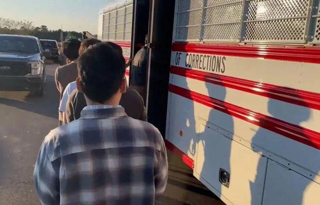 美国移民和海关执法局发布的照片:现代工厂被捕工人正排队上车