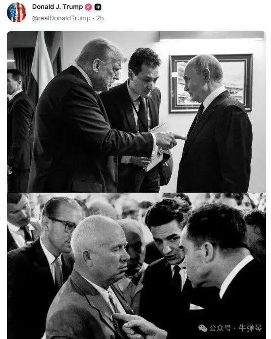 特朗普应该是拿过来做对比。所以,他放的另一张图片,就是在阿拉斯加会晤中,他同样右手食指指向普京的照片。