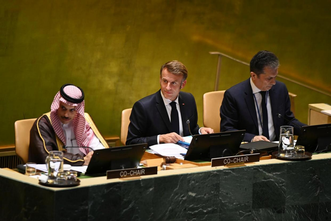 9月22日,在位于纽约的联合国总部,法国总统马克龙(中)与沙特阿拉伯外交大臣费萨尔(左)共同主持和平解决巴勒斯坦问题和落实“两国方案”高级别国际会议 图:新华社