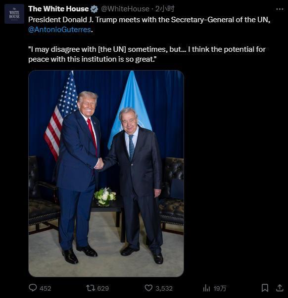 在贬低联合国后,特朗普与古特雷斯会面 推文截图