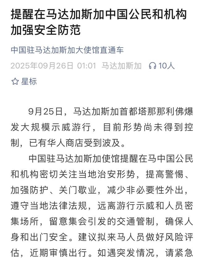 9月25日,马达加斯加首都塔那那利佛爆发大规模示威游行,目前形势尚未得到控制,已有华人商店受到波及。中国驻马达加斯加使馆... 9月25日,马达加斯加首都塔那那利佛爆发大规模示威游行,目前形势尚未得到控制,已有华人商店受到波及。中国驻马达加斯加使馆提醒在马中国公民和机构密切关注当地治安形势,提供警惕、加强防护、关门歇业,减少非必要性外出,遵守当地法律法规,远离游行示威和人员密集场所,留意集会引发的交通管制,确保人身安全和出门安全。