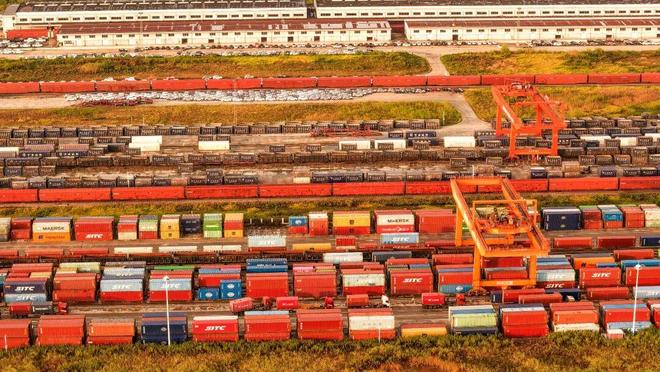 中欧班列集装箱整齐排列(资料图) 图源:视觉中国