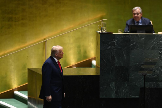 9月23日,在位于纽约的联合国总部,美国总统特朗普(左)在第80届联合国大会一般性辩论上准备登台发言 图:新华社