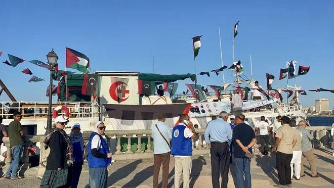 9月21日,在利比亚的黎波里,人们为一艘向加沙运送人道主义救援物资的船只送行。以色列外交部22日发表声明说,以方将阻止向加沙地带运送人道主义物资的“全球坚韧”船队抵达加沙地带 图:新华社