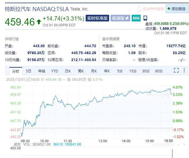 特斯拉报459.46美元,涨3.31%,最新市值1.53万亿美元,其市值一夜增加490亿美元(约合人民币3489亿元)。