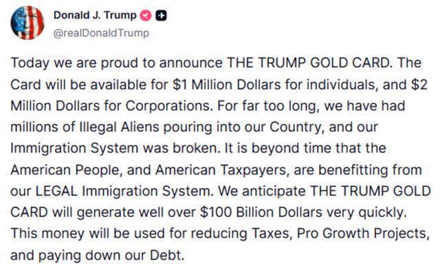 特朗普在社交媒体平台上说,美国的移民体系亟待改革,预计“特朗普金卡”很快将带来远超1000亿美元的收入。这笔资金将用于减税、推动经济增长的项目以及偿还国债。特朗普在另一条帖文中写道,“现在就购买特朗普金卡,”并链接了一个政府网站。