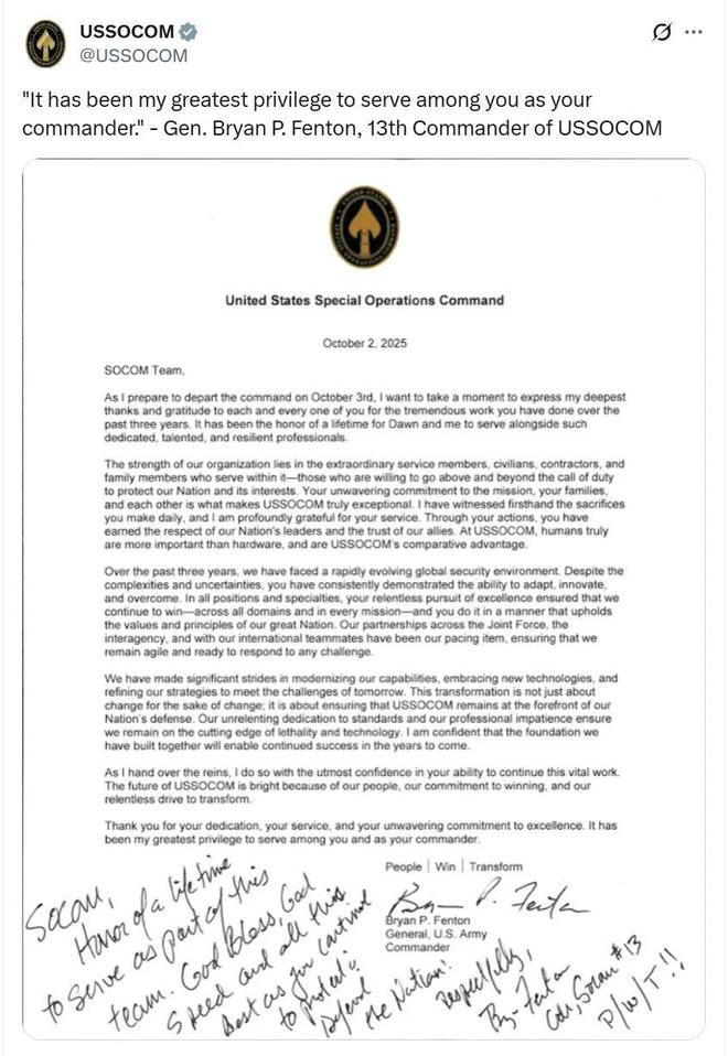 资料显示,芬顿于1987年加入美军,曾任国防部长高级军事助理、印太司令部副司令。自2022年8月,芬顿就任美国特种作战司令部第13任司令,该部门负责组织、训练并指挥美军在全球范围内的特种作战部队,以执行各类战略任务。