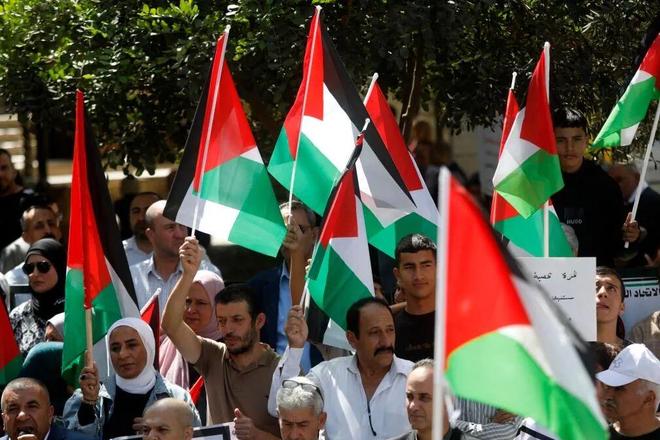 9月23日,在约旦河西岸城市希伯伦,民众挥舞巴勒斯坦旗帜参加庆祝多国承认巴勒斯坦国(图/新华社)