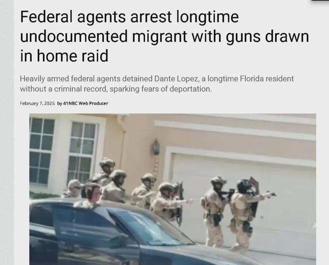 甚至于,据美国有线电视新闻网(CNN)2月5日报道,一位已经在佛罗里达州生活了15年、没有犯罪记录,且正在申请绿卡的三孩父亲,居然差点被数名全副武装的ICE执法人员直接砸门抓走。好在这位父亲的律师也在场,指出了这些执法人员程序违法,并没有法庭的逮捕令,才迫使这些执法人员离开。