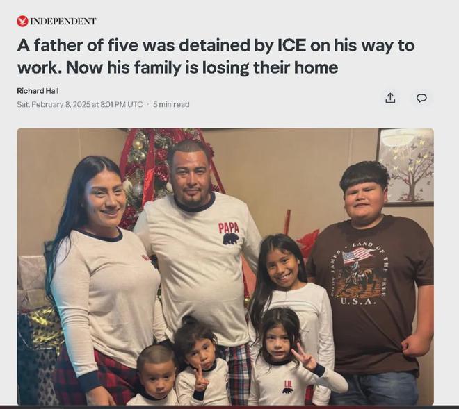 根据英国《独立报》的报道,美国得克萨斯州南部的一个五孩家庭的父亲——同时也是家中唯一的经济来源,最近就在外出给汽车加油的路上,被一群美国执法人员抓走了,搞得家里的母亲不得不为如何供养5个孩子以及还房贷而苦恼。家里的孩子更是天天在问:爸爸去哪儿了?