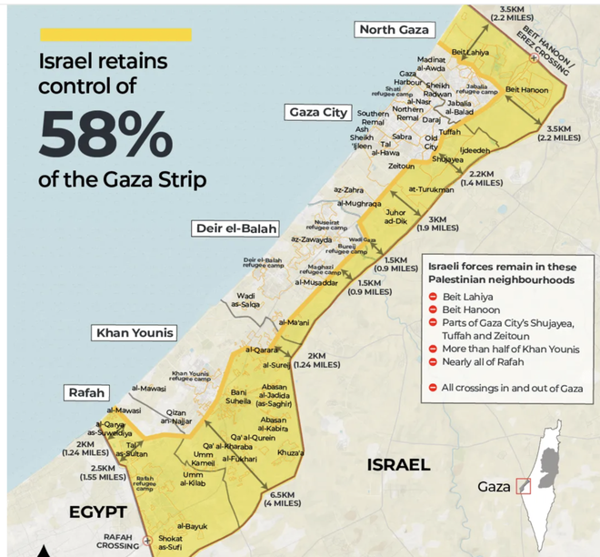 ▲第一阶段仍有约占加沙面积58%的土地仍在以色列控制范围之下