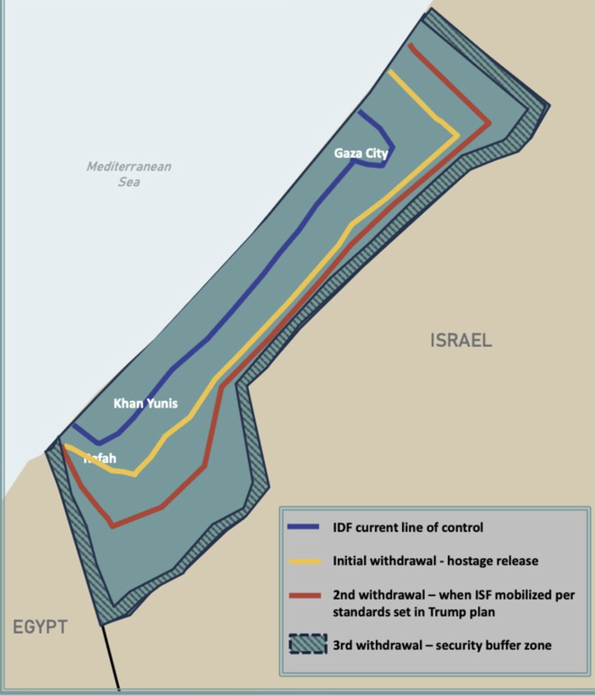 其中,蓝色线是以军目前的控制线。黄色线是以军第一阶段要撤到的位置,红色线是以军在第二阶段要撤到的位置,阴影处是以军第三阶段撤到的“安全缓冲区”。