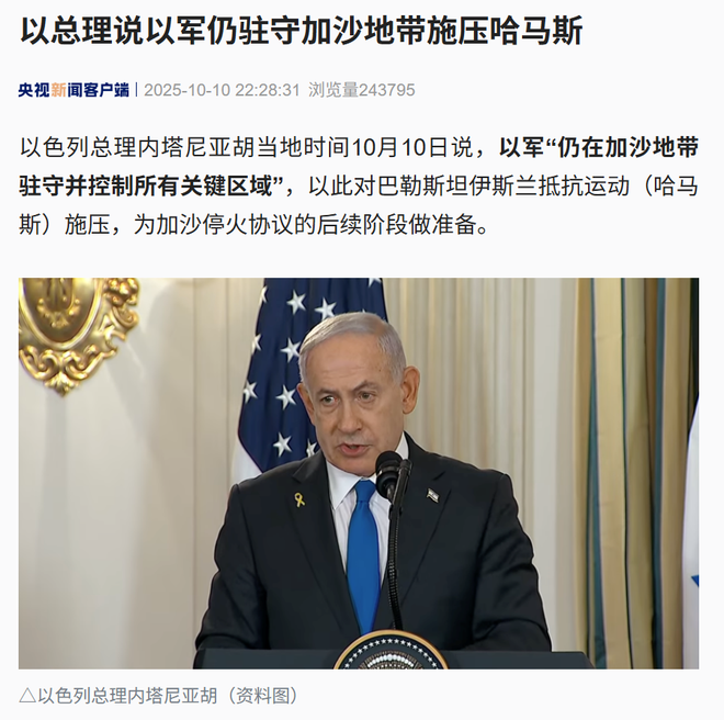 以色列总理内塔尼亚胡当地时间10月10日说,以军“仍在加沙地带驻守并控制所有关键区域”,以此对巴勒斯坦伊斯兰抵抗运动(哈马斯)施压,为加沙停火协议的后续阶段做准备。