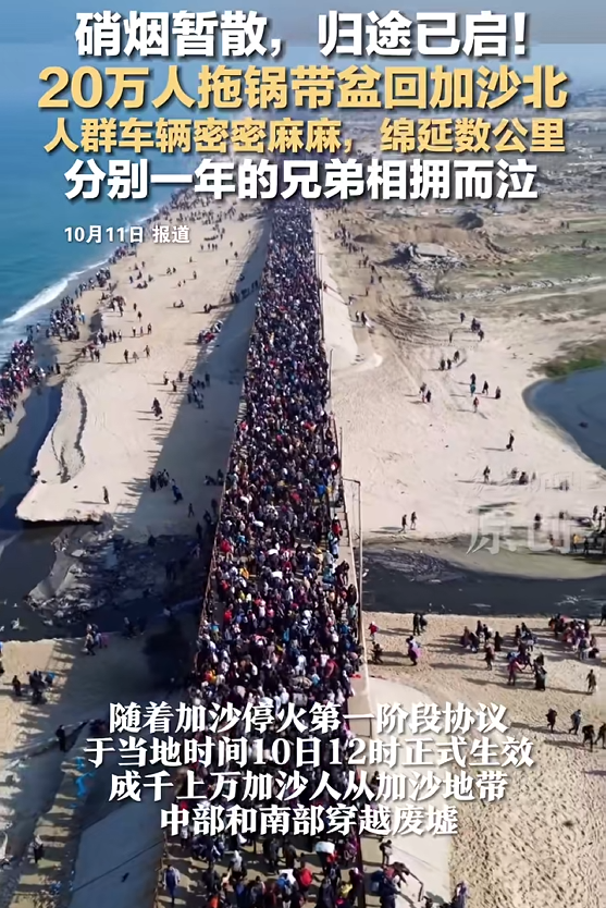 硝烟暂散,归途已启。加沙北部街道上,流离失所者携家带口重返故里的身影,成为停火后最动人的画面。