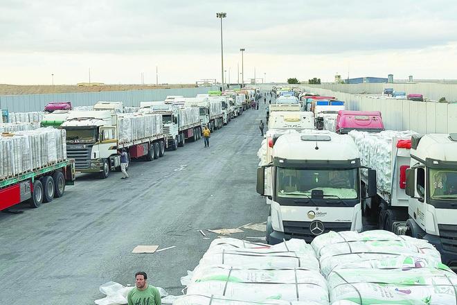12日,运载国际人道主义救援物资的卡车停靠在拉法口岸埃及一侧 ,等待进入加沙地带 视觉中国