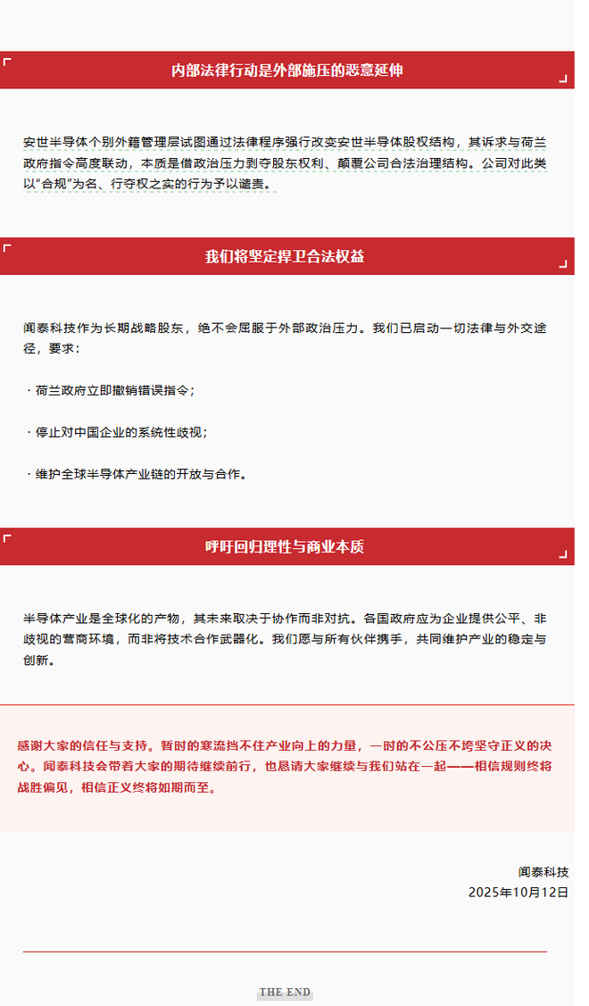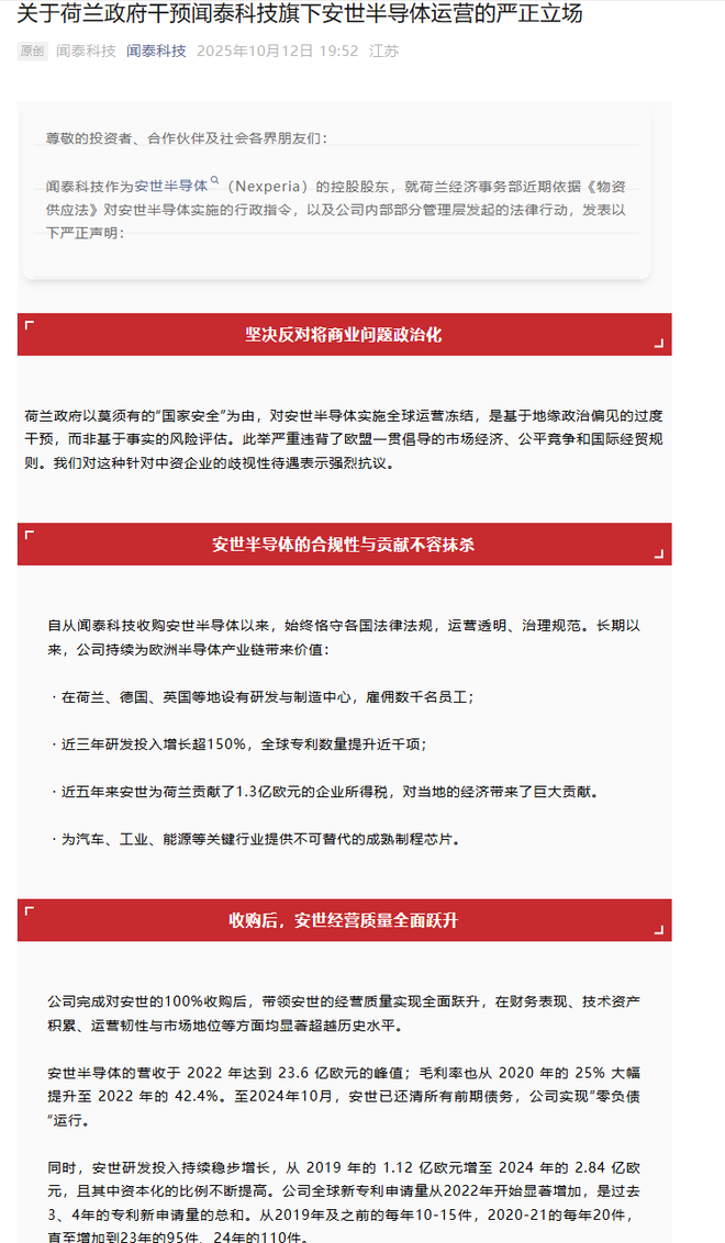 10月12日晚间,闻泰科技发表声明称,荷兰政府以莫须有的“国家安全”为由,对安世半导体实施全球运营冻结,是基于地缘政治... 10月12日晚间,闻泰科技发表声明称,荷兰政府以莫须有的“国家安全”为由,对安世半导体实施全球运营冻结,是基于地缘政治偏见的过度干预,而非基于事实的风险评估。此举严重违背了欧盟一贯倡导的市场经济、公平竞争和国际经贸规则。安世半导体个别外籍管理层试图通过法律程序强行改变安世半导体股权结构,其诉求与荷兰政府指令高度联动,本质是借政治压力剥夺股东权利、颠覆公司合法治理结构。公司对此类以“合规”为名、行夺权之实的行为予以谴责。