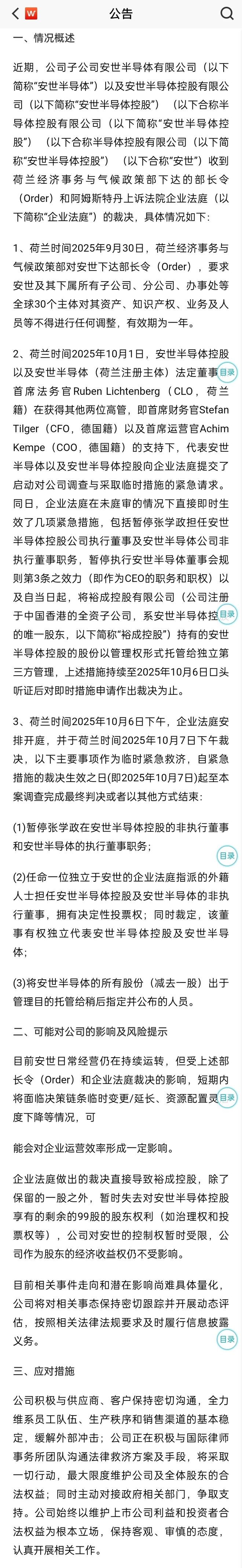 10月12日,闻泰科技公告,荷兰政府9月30日发出指令,要求冻结闻泰科技的控股子公司安世半导体对资产、知识产权等进行调整... 10月12日,闻泰科技公告,荷兰政府9月30日发出指令,要求冻结闻泰科技的控股子公司安世半导体对资产、知识产权等进行调整,为期一年。与此同时,安世半导体部分外籍高管要求闻泰科技转让安世半导体股权,要求暂停闻泰科技委派的CEO职务。