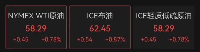 截至发稿,WTI原油期货涨0.45美元,涨幅0.78%,报58.29美元/桶;布伦特原油期货涨0.54美元,涨幅0.87%,报62.45美元/桶。
