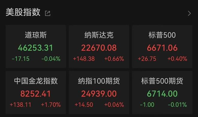 截至美东时间周三收盘,道指跌17.15点,跌幅为0.04%,报46253.31点;纳指涨148.38点,涨幅为0.66%,报22670.08点;标普500指数涨26.75点,涨幅为0.40%,报6671.06点。