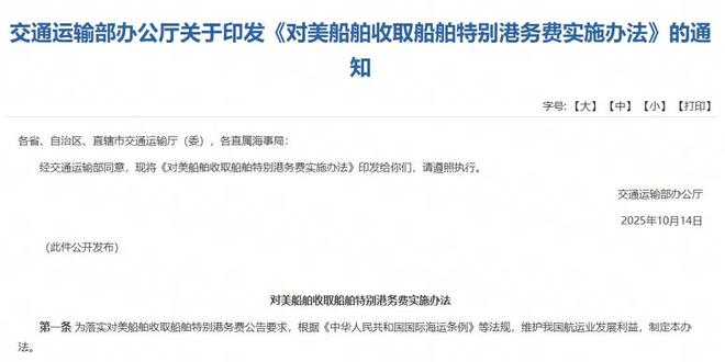 据新华社报道,交通运输部10月14日印发《对美船舶收取船舶特别港务费实施办法》。根据《中华人民共和国国际海运条例》,经国务院批准,交通运输部发布《交通运输部关于对美船舶收取船舶特别港务费的公告》,决定将于2025年10月14日起对涉美船舶收取船舶特别港务费,这是维护中国产业、企业合法权益和国际航运公平竞争环境的正当举措。办法是落实公告的具体安排。