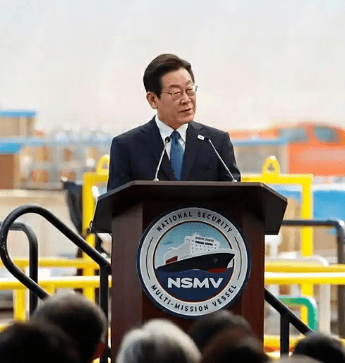 韩国总统李在明参观韩国韩华集团旗下造船厂期间发表讲话