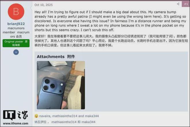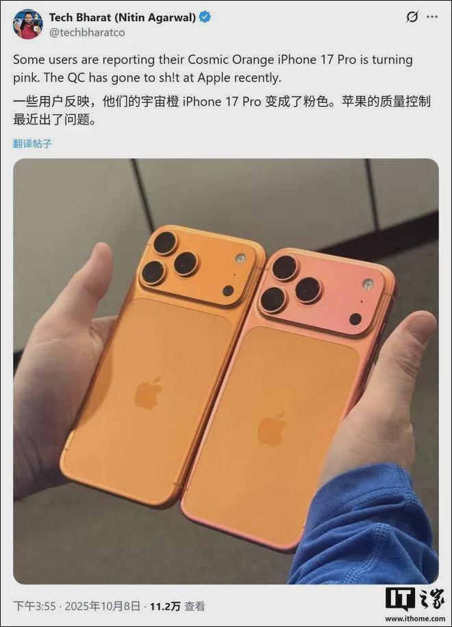 科技媒体 GSMArena 10月18日发布博文,称部分苹果 iPhone 17 Pro 及 iPhone 17 Pro... 科技媒体 GSMArena 10月18日发布博文,称部分苹果 iPhone 17 Pro 及 iPhone 17 Pro Max 的首批用户反映,其设备遭遇了机身褪色问题,主要集中在“星宇橙”和“深蓝色”两种配色上。