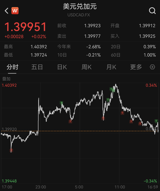 在特朗普宣布上述消息后,加元汇率直线跳水,美元兑加元一度涨0.34%,随后受美联储降息预期升温影响,涨幅有所收窄,截至当日收盘,报1.39951。