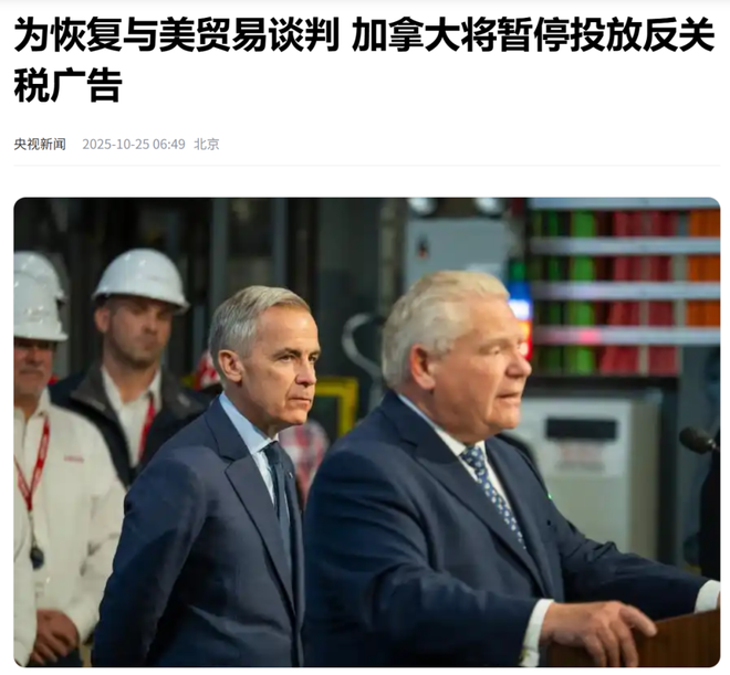 当地时间24日,加拿大安大略省省长道格·福特表示,在与加拿大总理卡尼沟通后,安大略省将暂停在美国投放的反关税广告,以便恢复与美贸易谈判。福特表示,该广告从下周一开始将不再播出。另有知情人士透露,卡尼23日晚间和24日与福特就广告进行了沟通,卡尼希望停止播放该广告。